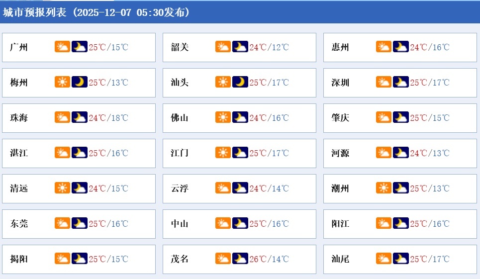 7日,全省大部晴到多云。最低气温:粤北、珠三角北部市县9~11℃,雷州半岛15~18℃,其余市县12~14℃。