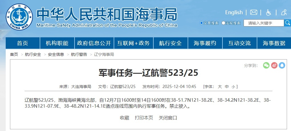 大连海事局发布航行警告,12月7日16时至14日16时,渤海海峡黄海北部部分海域执行军事任务,禁止驶入。